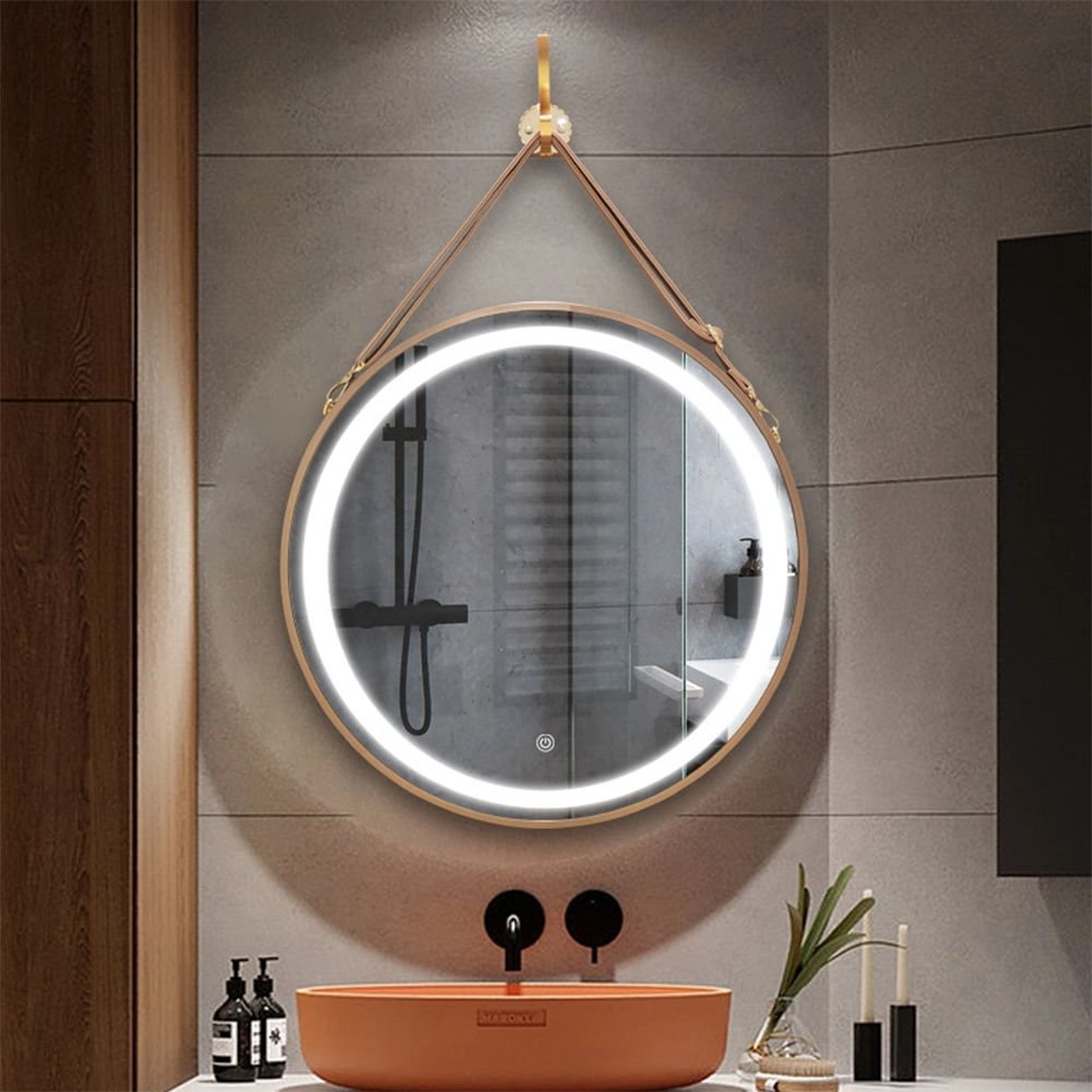 • ผนังห้องน้ำกระจกกลม LED พร้อมเข็มขัดสายหนังกระจกสมาร์ทกระจกติดผนังตกแต่งบ้าน Bluetooth กระจกแต่งหน้าอุปกรณ์ห้องน้ำเฟอร์นิเจอร์ร้านเสริมสวย